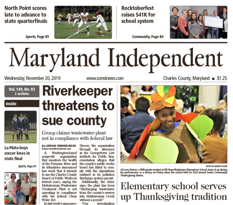 Maryland Independent November 20, 2019 Riverkeeper Threatens to Sue County – Group claims wastewater plant not in compliance with federal law by Lindsay Renner-Wood Download page 1 (PDF) | Download pg 2 (PDF)